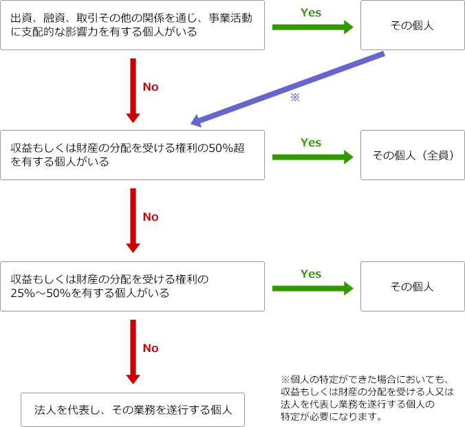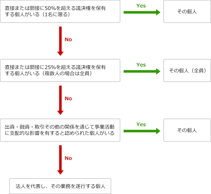 実質的支配者とは、法人の場合にあって、当該法人の事業活動に支配的な影響力を有すると認められる個人をいいます。実質的支配者の「氏名、生年月日、住所」の申告が必要となります。