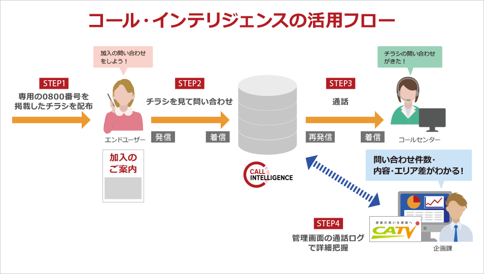 さらに、ケーブルテレビ加入促進用チラシを3エリア毎に測定用電話番号を振り分け、同じ案内でも、エリアによっての反響の違いが可視化できました。これにより、チラシの内容や配布量の見直しなどがはかれると考えています。