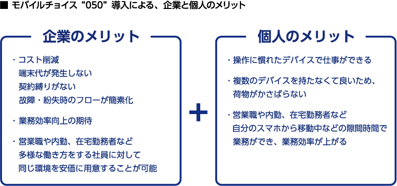 モバイルチョイス“050”は個人所有のスマートフォンや携帯電話にビジネス用の「050番号」を付与し、ビジネスとプライベートで「番号」「通話料」を自動的に公私分計できるサービス。初期費用・月額基本料がかからないため(※導入当時)、多数の携帯電話を導入していた企業にとっては大きなコスト削減をはかることができ、利用者にとっては、