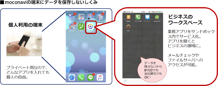 高橋氏が製品ホームページなどでmoconaviの機能を調べたところ、moconaviであれば端末にデータを残さないセキュアなモバイル環境を提供することができ、情報漏洩などの心配がないと直感的に感じたとのこと。