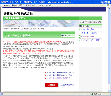 インターネット明細の「入力画面」をクリックします。