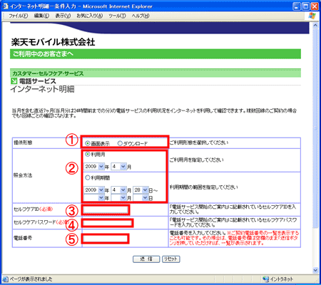 利用状況明細を確認する契約電話番号は-(ハイフン)なしで入力します。(下図 5番)