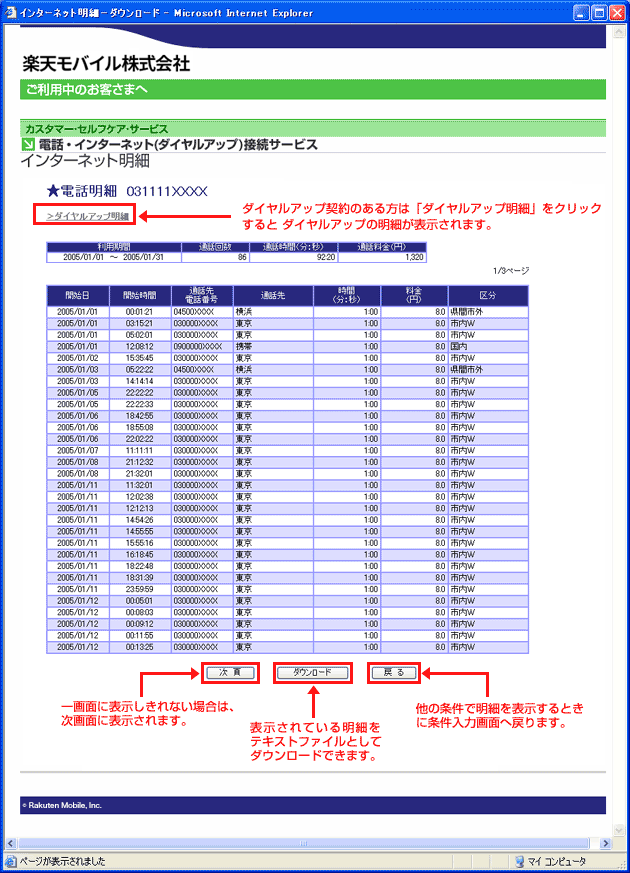 入力した電話番号の指定した期間中の通話明細が画面上に表示されます。