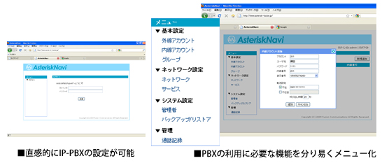 フュージョンでは、昨年11月から商用網を利用したAsteriskの接続検証を行っており、この度、開発したAsterisk Naviを検証ソフトウェアとして追加いたします。Asterisk Naviは、グラフィカルなユーザーインターフェイス(GUI)により、Webブラウザから簡単に、IP-PBXを構築出来ます。設定方法は、専用サイトからダウンロードしたAsterisk Naviを、PCにインストールし、シンプルなGUIを利用して(1)外線の電話番号とパスワードの設定 (2)内線アカウントの設定 (3)内線番号のグループ設定と、わずか3つのステップ※3で、完了します。内線端末は最大200台まで設定する事ができ、外線・内線通話はもとより、コールピックアップやパーク保留、多様な転送機能といった通常のビジネスでよく利用する機能を保有します。