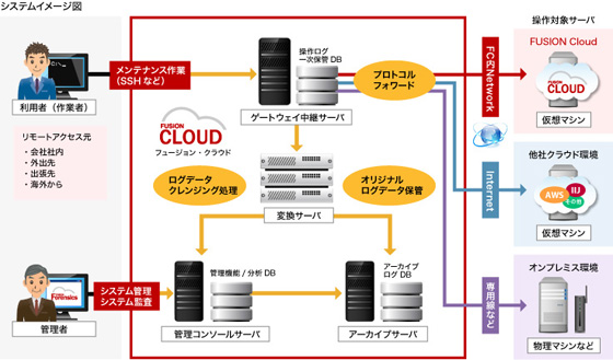「FUSION Forensics」は、クラウドサービスを利用しているあるいは自社システム環境を持つ企業向けに、特権ユーザやシステムエンジニアなどが実施する操作ログの保管及び分析・検索を行う、操作ログ監査証跡サービスです。内部からの不正アクセスに対する抑止力につながることはもちろん、ログ分析の容易性によって有事の際の当該者の発見の迅速化などセキュリティの向上が期待できます。これまでクラウドサービスではほとんど提供されてこなかった操作ログ監査証跡サービスを、クラウド型で月額課金かつ安価に提供することで、大企業向けに加えてこれまで導入が難しかった中堅・中小企業にもご利用いただけるようになります。