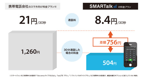 携帯電話会社がスマートフォン向けに提供する料金プランとIP-Phone SMART(SMARTalk)の料金プランの違いは以下のとおりです。