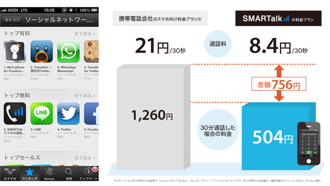 iOS版「SMARTalk」では、基本料金が無料、しかも、発行される050で始まる電話番号から携帯や固定電話への通話料が60%も安くなることから、想定をはるかに上回る反響を呼び、リリース翌日の14日にはAppStoreのソーシャルネットワーキングカテゴリで2位を獲得いたしました。