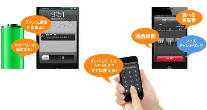 「SMARTalk」は、「IP-Phone SMART」をご利用いただくための初期設定が完了しております。ユーザーは、「IP-Phone SMART」の申し込み時に発行されるSIPアカウントとパスワードを入力するだけで、すぐにご利用いただけます。 - プッシュ通知でバッテリーの消耗を抑えられる