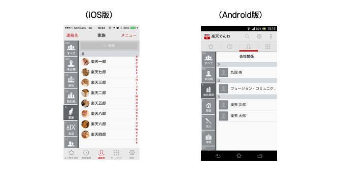 「楽天でんわ」をご利用中のユーザーから数多くいただいた「電話帳をグループ化できる機能が欲しい」というご要望にお応えするため、今回の機能追加を行いました。iOS版、Android版のスマートフォンアプリで、本日より電話帳グループ機能をご利用いただけます。