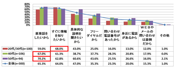 「直接話をしたいから」(65.3%)、「すぐに情報を知りたいから」(64.0%)が電話で問い合わせをする理由の上位となりました。わからないことをすぐに直接聞くことのできる点が、電話での問い合わせが好まれる理由であることが上記グラフから読み取れます。また、年代によって理由も異なり、40代・50代は「直接話をしたいから」が理由として最も多く挙げられましたが、20代・30代は「すぐに情報を知りたいから」が最も多い理由となっています。