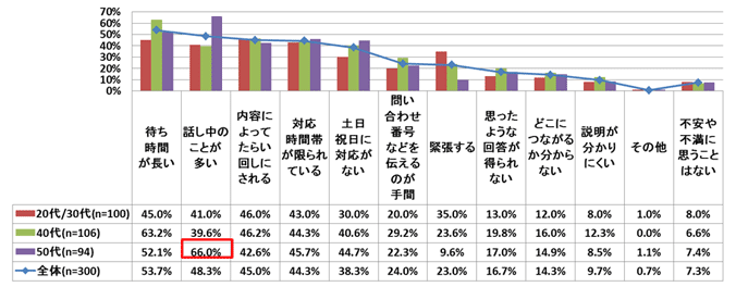 電話での問い合わせサービスの不満として、最も多い回答は「待ち時間が長い」となり、53.7%の方が回答しました。次いで「話し中のことが多い」(48.3%)、「内容によってたらい回しにされる」(45.0%)という回答が並びました。年代で比較をすると、50代は「話し中のことが多い」ことへの不満が顕著となっています。