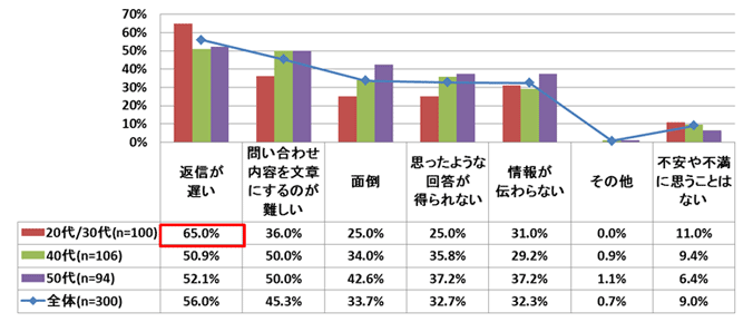 メールやWEB上での予約・問い合わせサービスに対して、不安や不満を聞いたところ、最も多い回答は「返信が遅い」となり半数以上の方が回答しました。特に20代・30代の方が多く感じているようです。「不安や不満に思うことはない」と回答した方はわずか9.0%となり、メールやWEB上での予約・問い合わせサービスに対し、不安や不満を少なからずもっている方が多いことが判明しました。