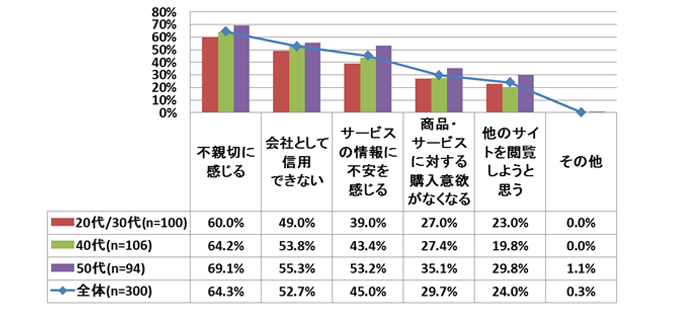 問い合わせ先電話番号が記載されていないWEBページに対して、64.3%の方が「不親切に感じる」と思っていることがわかりました。次いで、「会社として信用できない」52.7%、「サービスの情報に不安を感じる」45.0%と続きます。年代が上がるにつれ、不満に思う傾向にあることがわかりました。「会社として信用できない」と半数以上が回答していることから、ホームページや広告などに問い合わせの電話番号を掲載しておくことは会社そのものの信用にもつながるといえます。