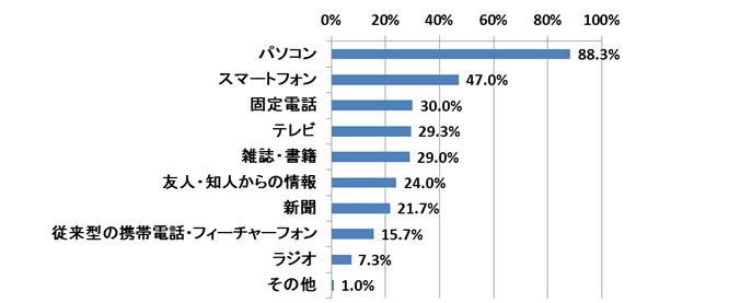 商品やサービスの情報収集に「パソコン」を利用する方が最も多く88.3%の方が回答しています。次いで「スマートフォン」(47.0%)、「固定電話」(30.0%)と電話が続く結果となりました。インターネットを使ってパソコンと同じようにたくさんの情報を収集でき、その後気になることがあればすぐに電話で問い合わせることのできる「スマートフォン」は商品やサービスについて情報収集する際に重宝されていることがわかります。
