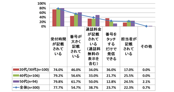 問い合わせをしやすいと思う電話番号の表示を聞いたところ、最も多い回答は「受付時間が記載されている」で77.7%の方が回答しました。また、「番号が大きく記載されている」も半数を超える方が回答しています。項目により、年代による差が表われる結果となっており、幅広い年代のニーズに合わせた電話番号の表示が必要とされていることが判明しました。