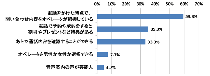 「あったらいいな」と思う電話対応のサービスを聞いたところ、最も多い回答は「電話をかけた時点で、問い合わせ内容をオペレータが把握している」となり、59.3%の方が回答しました。次いで、「電話で予約や成約をすると割引やプレゼントなど特典がある」(35.3%)、「あとで通話内容を確認することができる」(33.3%)という回答となりました。