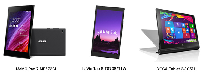 新たに販売するタブレット端末はASUS JAPAN株式会社(本社:東京都千代田区、代表取締役社長 エミリー・ルー)の「MeMO Pad 7 ME572CL」、日本電気株式会社(本社:東京都港区、代表取締役 執行役員社長:遠藤 信博)の「LaVie Tab S TS708/T1W」、レノボ・ジャパン株式会社(本社:東京都千代田区、代表取締役社長:留目 真伸)の「YOGA Tablet 2-1051L」です。