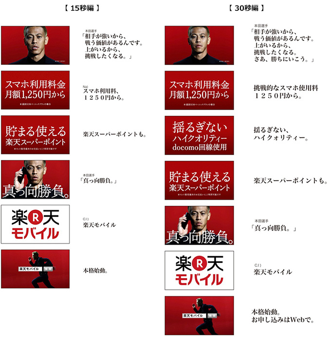 「楽天モバイル」は、2014年10月のサービス開始以来、通信業界の常識を打ち破るべく、様々な新サービス・商品を市場に投入し、挑戦を続けています。その「楽天モバイル」の強い覚悟や熱い思いを伝えるのは、強い意志を持ち、常識にとらわれず精力的に活動を続ける本田選手がふさわしいと考え、今回の起用に至りました。