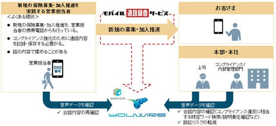 2016年5月29日から「改正保険業法」が施行される背景もあり、手軽に導入でき、安全で便利な携帯電話通話録音サービスへの要望が高まるなか、通話録音ファイルの保管・検索ソフトウェアで実績のある「YouWire®」と「モバイル通話録音サービス」を連携させることで、さらなる利便性を追求し、ユーザーのニーズに応えるサービスを実現します。