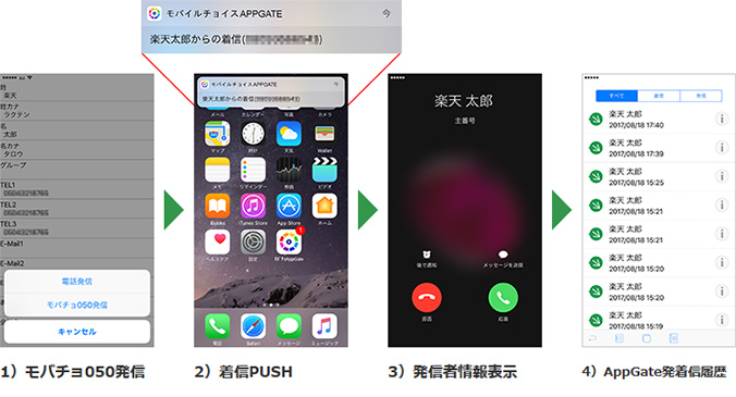 「モバイルチョイス・アップゲート(App Gate)」の電話帳からの発信ならびに着信時の発信元通知受信が可能です。