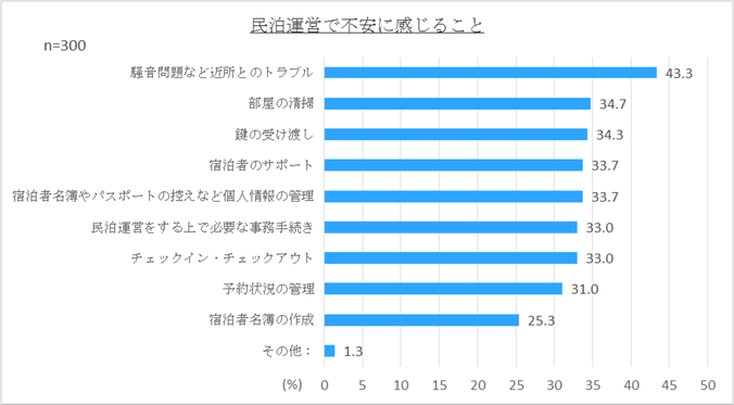 民泊を運営していく上で不安に感じることは何か質問したところ、「騒音問題など近隣とのトラブル」が43.3%と最多となり、民泊運営には「ご近所への配慮」が欠かせないと考えている民泊運営事業者が多いことがわかりました。