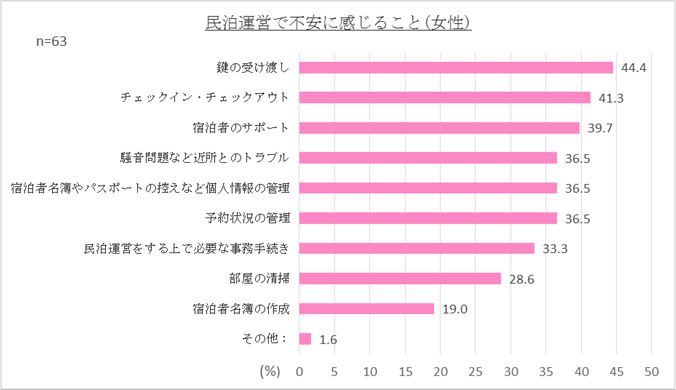 女性の民泊運営事業者が運営上で最も不安に感じていることは「鍵の受け渡し」であることがわかりました。その他、外国旅行客との文化や習慣の違いによるトラブルや言語障壁などへの不安の声も寄せられました。