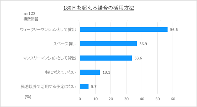 住宅宿泊事業法(民泊新法)の範囲で運営を検討している事業者は約4割。そのうち大半が180日ルール以外の活用方法は「マンスリーマンション、ウィークリーマンション、スペースとして貸し出しする」と回答