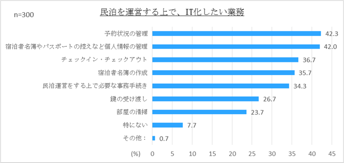 民泊運営事業を進めていくなかで、工数を削減出来るITサービスを使用したいか質問したところ、71.0%がそう思うと回答した。その中でも、特にITを活用したい業務として、「予約状況の管理」「個人情報の管理」「チェックイン、チェックアウトの管理」などが挙げられました。また、AIを活用した運営も視野に入れているという声も寄せられました。