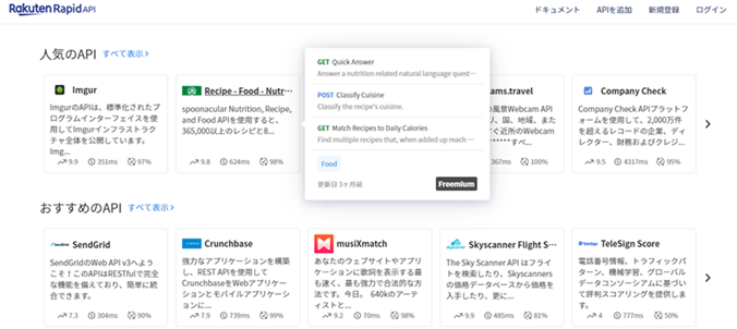 ・「カテゴリー」や「APIコレクション」ごとにラインナップされたAPIにカーソルを合わせ、人気上位のエンドポイント(注3)や価格プラン、カテゴリー、最終更新日などの追加情報をポップアップさせることで、スピーディーな情報収集と開発支援を実現します。