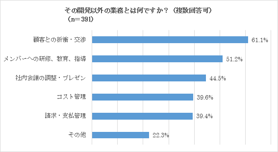 IT系開発者の就業状況において、本業の開発以外の業務を行っている割合が75%を超えていました。そのうち「顧客との折衝・交渉」(61.1%)と回答した人が最も多く、「メンバーへの研修、教育、指導」(51.2%)、「社内会議の調整・プレゼン」(44.5%)、「コスト管理」(39.6%)、「請求・支払管理」(39.4%)と続きました。IT系開発者は、多岐にわたる業務を行いながら、開発業務を行う就業環境にあるケースが大半を占め、業務効率化が必要不可欠であることがうかがえました。