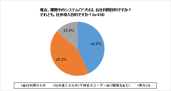 現在、開発中のシステム/アプリは、自社利用と社外導入目的がほぼ同数