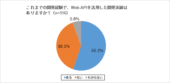 これまでの開発経験で、Web-APIを活用した開発実績があると回答した開発者は、55.2%と半数以上となりました。「APIエコノミー」が拡大から普及期へ向かい、APIの活用によるイノベーション事例の増加とともに、Web-APIが開発者の業務効率化に寄与している様子がうかがえました。 その一方、前述した「開発業務効率化のためのツールは、何を利用していますか?」に対する回答では「APIマネジメントツール/クライアントツール」の利用が17.2%で、APIを活用した開発実績に対し、開発業務効率化を目的とするAPI関連ツールの利用は、比較的少ない結果となりました。