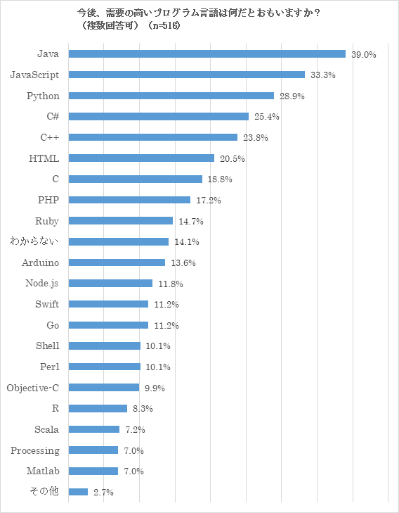 開発者が考える「今後、需要の高いプログラム言語」の上位は「Java」39.0%、「JavaScript」33.3%、「Python」28.9%
