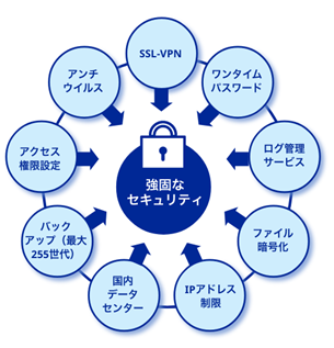 - ・SSL-VPNでの接続、IPアドレス制限やウイルス対策、ログ管理、ファイル暗号化などの情報漏洩および不正アクセス対策機能を標準装備