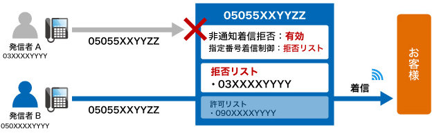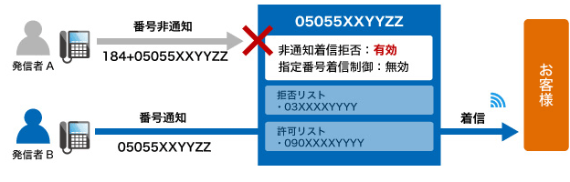 FUSION IP-Phoneへの着信時に、非通知又は予め指定した電話番号からの着信を拒否したり、指定した電話番号のみ着信を受ける事が出来るサービスです。- 非通知着信拒否