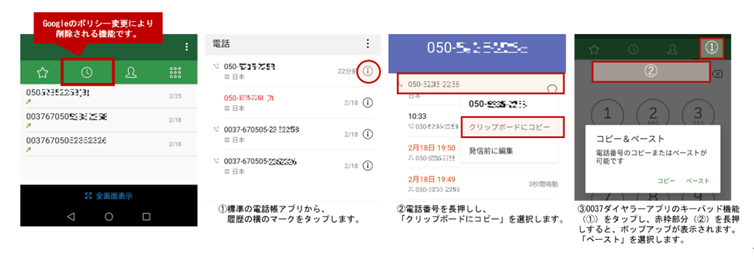 この度は、本サービス利用の際にご活用いただいております「Android版0037ダイヤラーアプリ」につきまして、Google社のポリシー変更に伴い、次回よりリリースされるバージョンより、発着信履歴機能を削除して提供することとなりましたので、以下の通りご案内申し上げます。