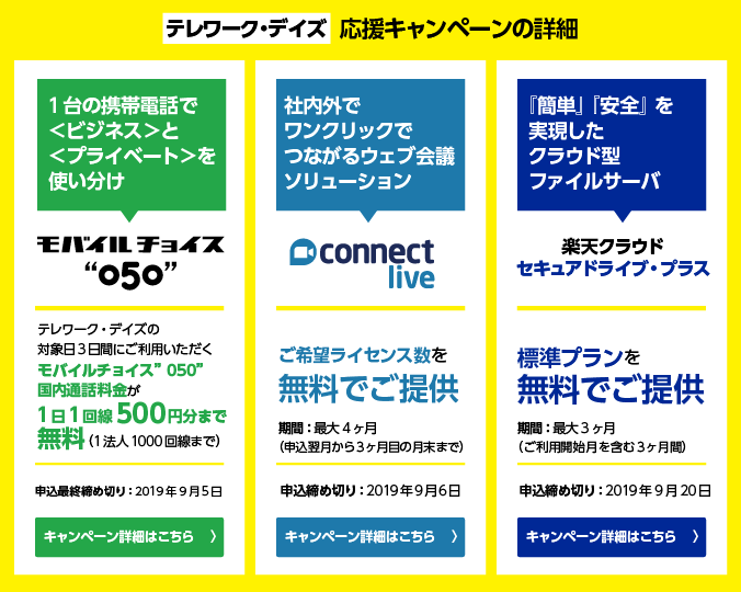 楽天コミュニケーションズでは、テレワーク・デイズに参加する企業を対象に、応援キャンペーンを実施いたします。テレワークに役立つサービスをご活用いただけますので、この機会にぜひご体験ください。